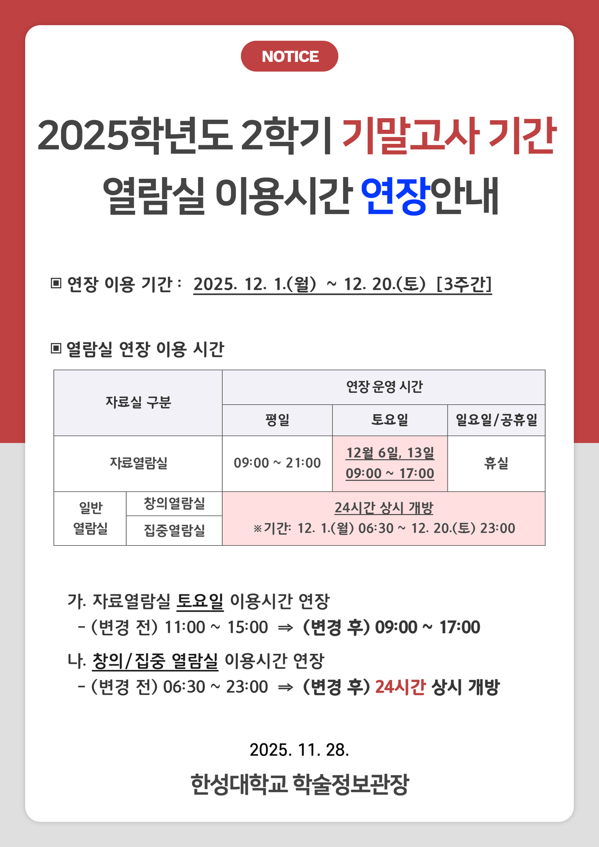 기말고사 기간 열람실 이용시간 연장 안내