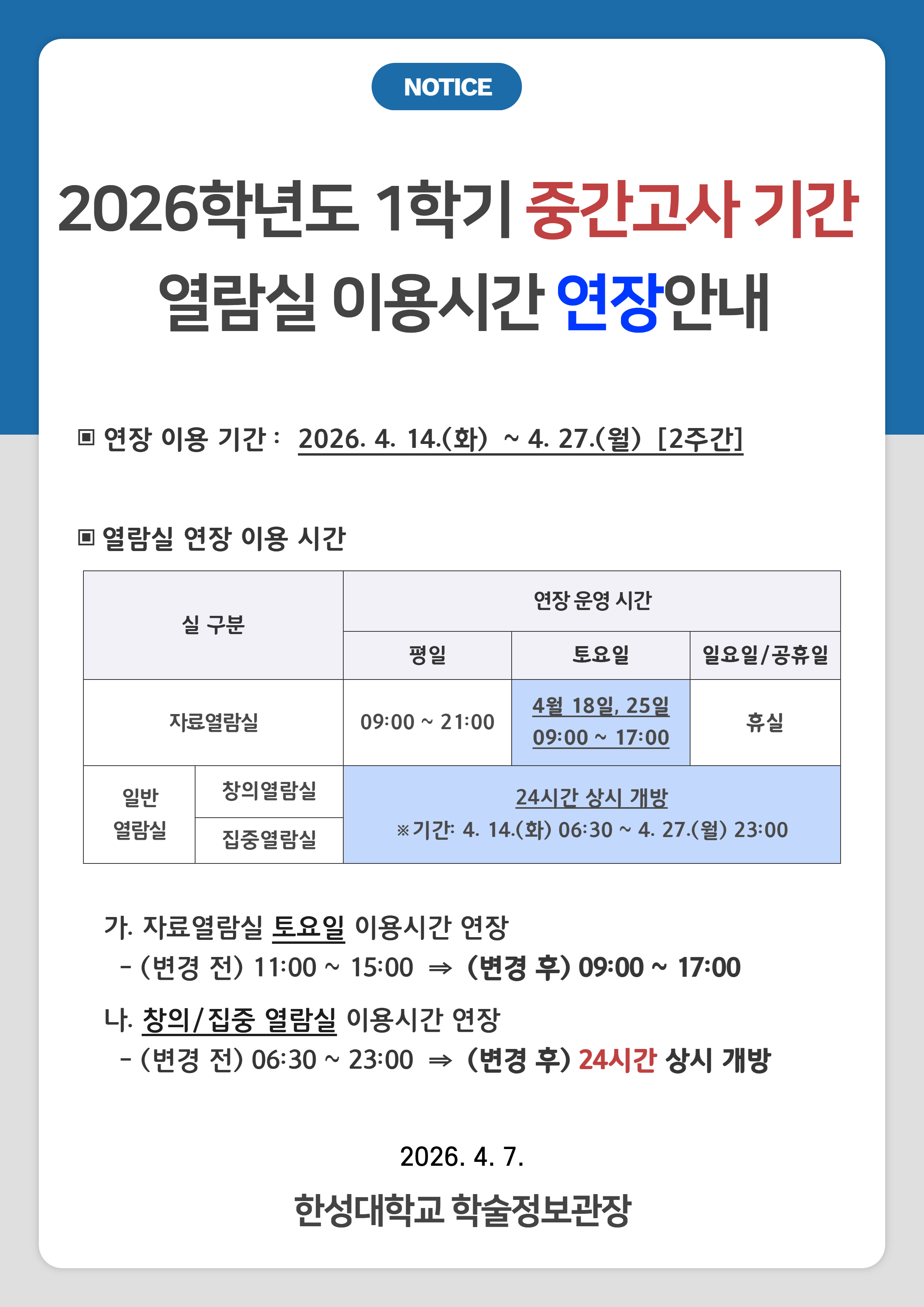 - 창의/집중 열람실 운영시간: (변경 전) 06:30~23:00 ⇒ (변경 후) 24시간